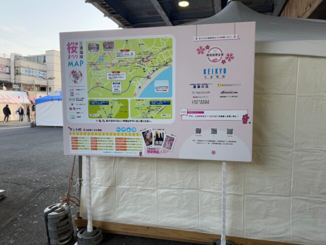 先週2月5日から開催中の三浦さくらまつりの設営を行いました。 駅前のテント村の設置 案内MAP看板設置 横断幕設置 市内各所に仮設トイレ設置 を行っております! 駅前に飾られた提…