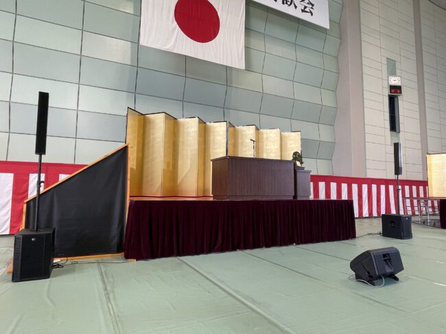 11月下旬に木更津市で斎場の落成式が行われました。 弊社では、演台や金屏風、お立ち台、横看板などの機材をご用意させていただきました! 金屛風があるだけで華やかな会場になりますね! セブンサービ…