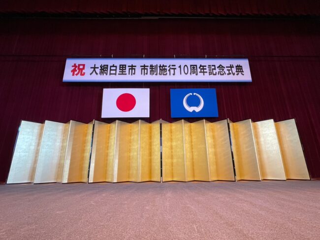 先日、大網白里市で市制施行10周年の記念式典が行われました。 弊社では、オートディスペンサーや、胸章、床の養生、看板の作成等の細かい備品までご用意させて頂き、 会場の設営のお手伝いさせて頂きました! 金屛風…